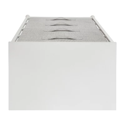 Get much needed storage at an economical price that works anywhere in your living space with this 4 drawer vertical organizer. Whether you need a place for current or out of season clothing, washcloths, or charging cords and remote controls, the four easy pull fabric drawers are a perfect solution. Use this vertical storage tower as a nightstand to hold your cell phone, glasses, or nighttime glass of water. Storage doesn’t have to be bulky to be strong. Metal screw construction securely joins the powder coated cast iron frame of this tall dresser together. The durable MDF wood top provides a hard surface to set books, lamps, or a vase of fresh flowers and holds up to 40 lbs. static weight capacity. Polypropylene fiber drawers not only look great but are fade and stain resistant to help this dresser with drawers retain its great looks. Quick and easy assembly can be achieved in 10 minutes or less with the step-by-step illustrated instructions or online PDF. Plastic adjustable floor glides protect your hard flooring surfaces and provide a stable platform on uneven flooring surfaces. Quickly remove spills with a clean damp cloth. Use this vertical dresser in or out of your closet for extra organization that goes above and beyond plain plastic bins. Additional Features: Rust Resistant Cast Iron Frame with Long-Lasting Metal Screw Construction, Adjustable Plastic Floor Glides provide a stable, level surface and protect hard flooring surfaces, Easily Cleans with Damp Cloth to retain its great looks, Assembles in Under 10 Minutes with illustrated instructions or online PDF, Stable storage solution for any room, mix and match from our entire collection
