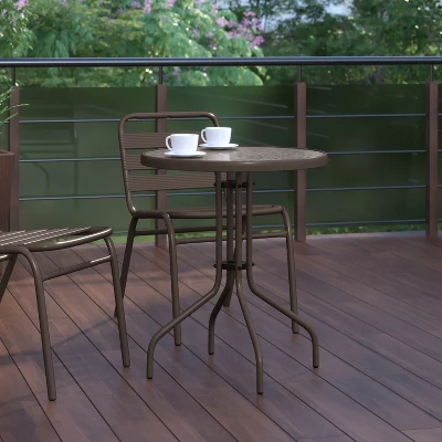 Whether you need to add more seating space or create an intimate conversation area, this versatile round tempered glass top table is up to the task. Enhance the look of your bistro, cafe, restaurant, hotel or home patio space without taking up too much real estate. The ripple designed table top features a smooth surface for keeping items level. A bronze powder coat finish lends the round-shaped table a bold, versatile appearance that matches well with your favorite chairs. Designed for all-weather use, this table is a great option for indoor and outdoor settings. For longevity, care should be taken to protect from long periods of wet weather. Whether you are just starting your business or upgrading your furniture this table is a wise investment.