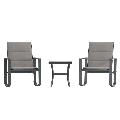 Spend some quality leisure time outdoors with this 3 piece all-weather rocking chair and table patio set. Boasting quick dry textilene flex comfort material, these rockers are perfect for poolside, patios and decks. Integrated armrests and smooth motion curved runners allow for total relaxation. The included glass topped side table not only looks great but also provides much needed horizontal real estate for drinks, cell phones, or snack plates. Powder coated steel frames are weather and rust resistant and allow the chairs to hold up to 300 lbs. static weight and the table to hold up to 50 lbs. static weight. Fixed floor glides on the table will prevent damage to your indoor flooring surfaces. Your new lounge set assembles in 30 minutes or less and wipes clean with a damp cloth making it ideal for busy households. This chair and table set is available in multiple colors to suit your personal taste.