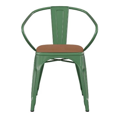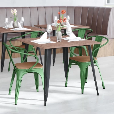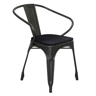 Spice up your kitchen or dining room by adding this colorful black metal chair with a long-lasting poly resin seat to your space. Whether your space is shabby chic, traditional or industrially styled, you’ll be surprised how easily this stackable metal chair will blend with your existing commercial or residential decor. This glossy metal chair features a curved back with a vertical slat, integrated arms, and a stabilizing cross brace. The polystyrene seat attaches to the preassembled chair in minutes and won’t rot, chip, or peel for year-round use. This trend-setting indoor/outdoor dining chair will make a great addition to your kitchen, dining room or restaurant. Mix and match colors to make your dining room and outdoor living space pop with color. Wipe clean with water and a neutral detergent to maintain the appearance. For longevity, care should be taken to protect the frame from long periods of wet weather.