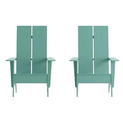 Furnish your lounge space with a fresh new take on a timeless classic with this set of 2 modern style Adirondack style chairs. The streamlined back and arms give this patio chair a sleek profile that will complement any dĂ©cor. The dual slat back boasts an unusual silhouette of clean, straight lines that look more modern than classic, making it an eye-catching addition to any backyard. Outdoor furniture takes a lot of punishment so durability is key when making a purchase. Constructed of weather-resistant polystyrene, this wood-like substance was designed to hold up in many environments and is strong enough to accommodate users up to 350 pounds static weight. Stainless steel hardware securely fastens this chair together and is weather resistant for long-lasting performance. Unlike traditional wood chairs there is no back breaking sanding, painting, or sealing and this low maintenance porch chair won’t rot, peel, or splinter. Best of all, this adirondack lounge chair can be easily cleaned with water and a neutral detergent. These all-weather adirondack chairs look modern but retain the timeless comfort Adirondack chairs are known for. Pair these chairs with our all-weather poly resin wood adirondack ottoman footrest for total comfort.